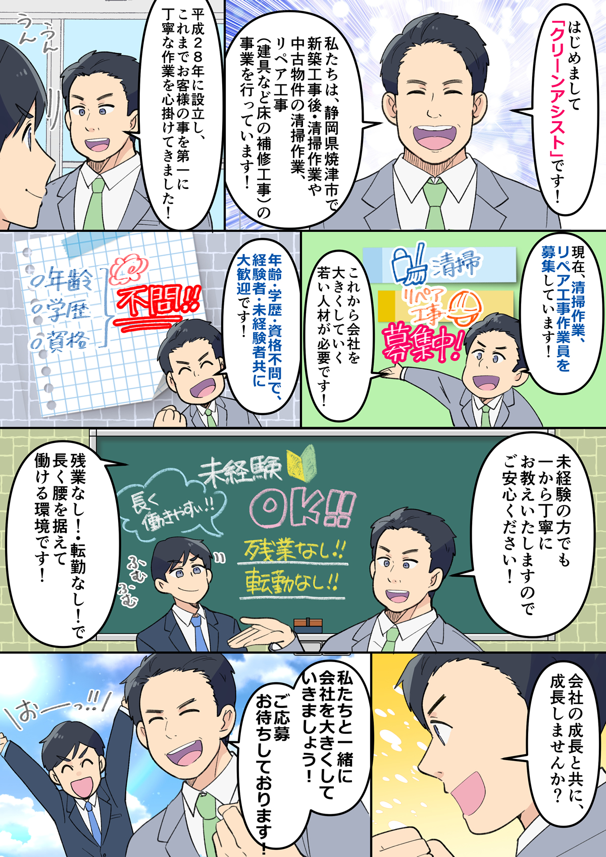 | 募集職種 | 清掃業(新築工事後・中古物件退去後) リペア工事 |